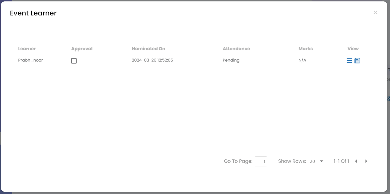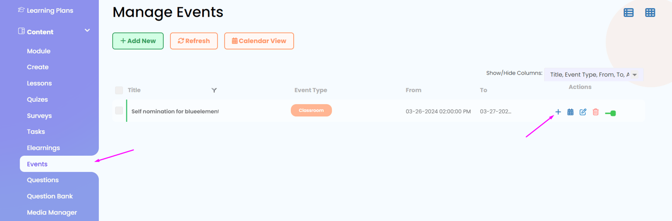 To approve or reject their nomination, go Events submenu present under the Content menu. Find your self-nomination event, then click on the plus icon from the Actions column.This will open a popup with a list of learners who have applied for the Event.