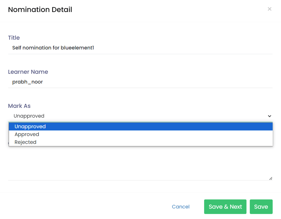 Then mark the Learner as approved in the popup that appeared. Then Save or Save & New to update the next learner.After the learner's nomination has been approved. The Event will be visible in his timeline.