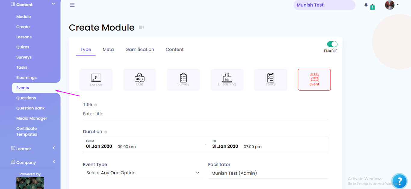 - Go to the Events submenu present inside the Content menu. Click on the Add new button. This will open a form with a "Create Module" heading, with Event as already selected.