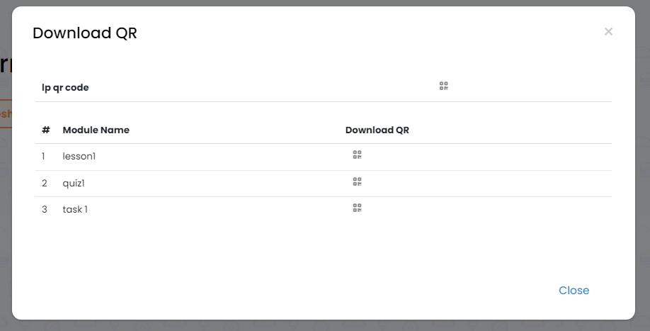 Click on the Download QR button next to the Learning Plan's or Module's name to download an image with a QR code.