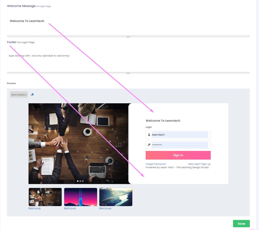 When you visit your domain's login page, such as mycompanyname.ezae.in, we can identify you and display your custom welcome and footer messages on the login pages for admins and learners.