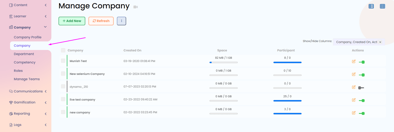 Here you can see and manage all the existing companies present in your system.