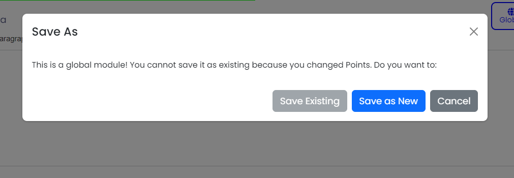 Global modules can be updated in other companies or their copy can be created. Similarly, its questions can be saved in the child company or updated globally.