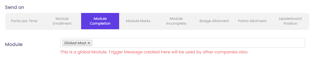 If a Trigger message of the global module is created in the parent company, then a warning message will be shown there. If that global module is used in the learning plan of the child company, then the triggered message will be created.