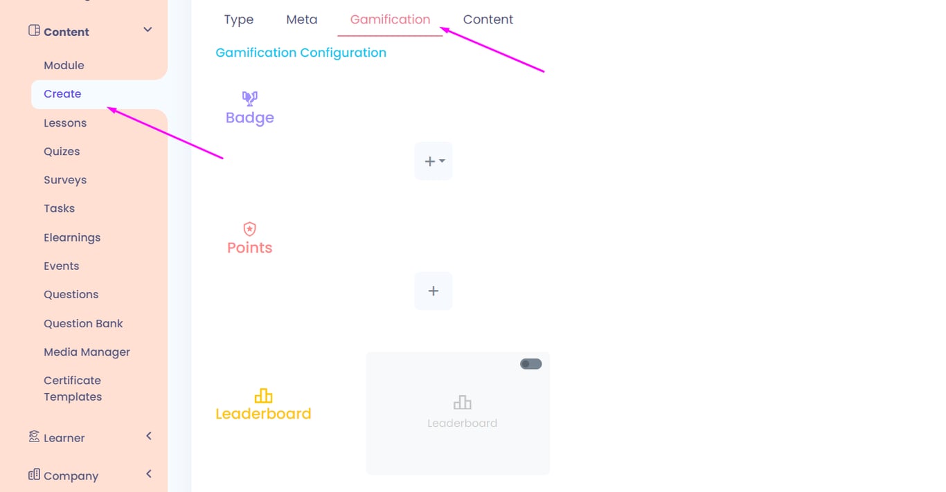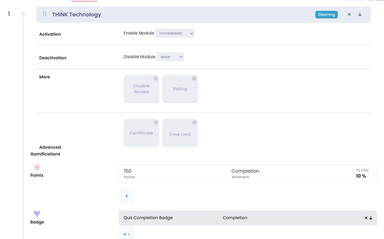 Select your module type, and fill in the module details. Click on the Gamification header on top of the module form. The gamification configuration section will be scrolled to your viewport.