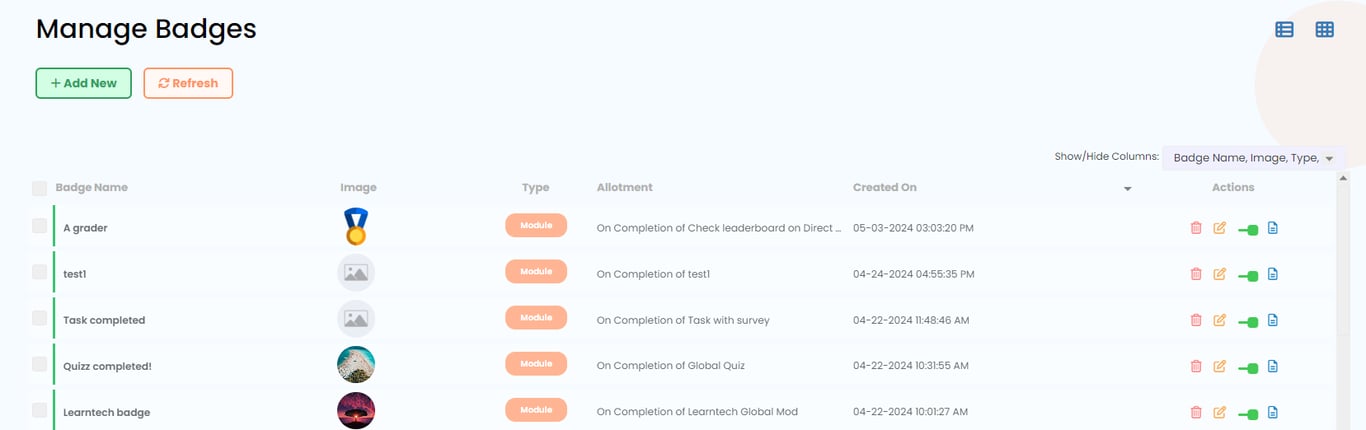 Here the list of all the Badges will be shown. You can edit any existing Badges from here. You can delete a Badge if it is not used in any of the Learning plans or Modules.