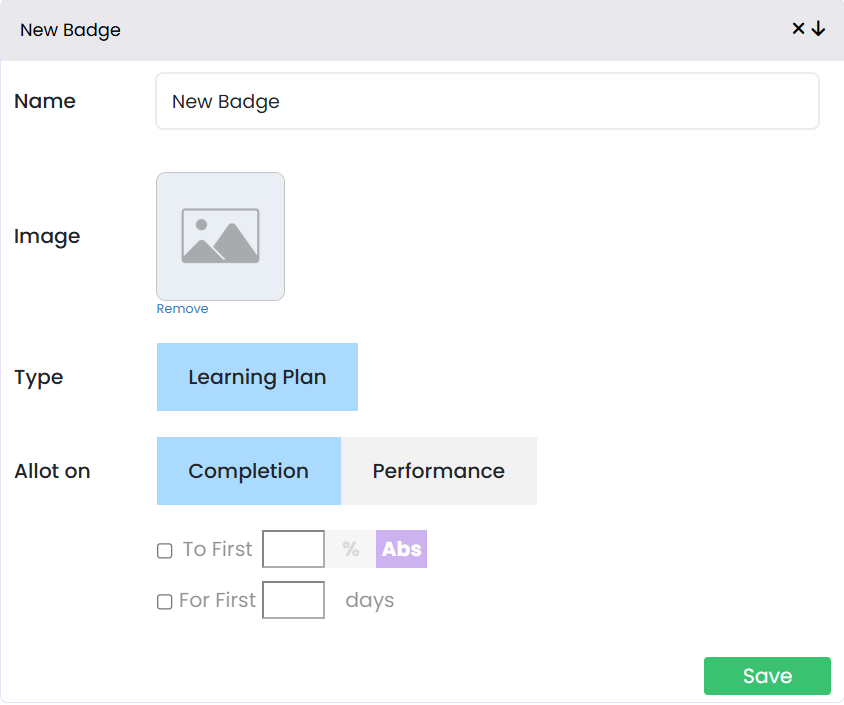 Fill in the Badge name, Image, and Allot on criteria- Completion / Performance.