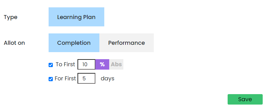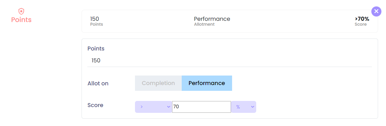 Allotment criteria can be set on Completion meaning that the learner will get the points as soon as he completes the module or it can be set on performance when we want the learner to achieve a certain Score criteria to achieve the points. The value of the points can a absolute or it can be in percentage terms.