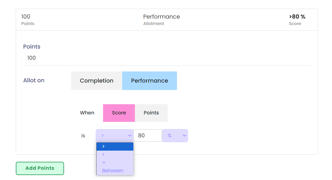 Add the points that you want to allot to the learner and the criteria. Then select the criteria if you want to add points based on the learner's Scores or Points.