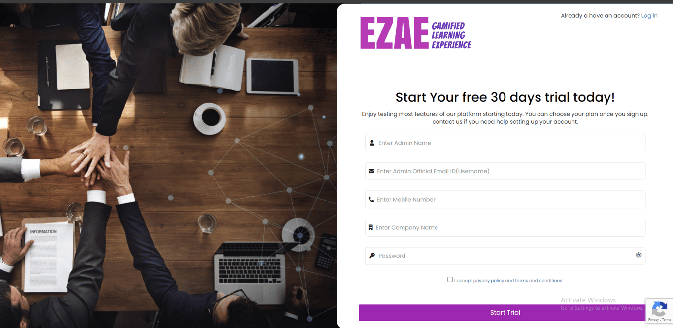 - Admin Official Email Id: Enter your Official email which is your Organization's email. Other common mail IDs like Gmail, Yahoo, etc. are not allowed. This email id will also be your username to log into the Ezae platform.