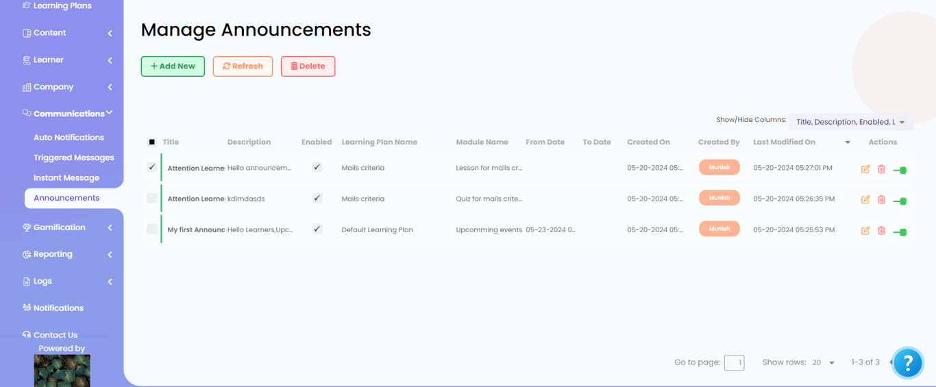 - Action: Icons for editing, deleting, and toggling the status of the announcement. Disabled announcements are not shown to the learner in any case.