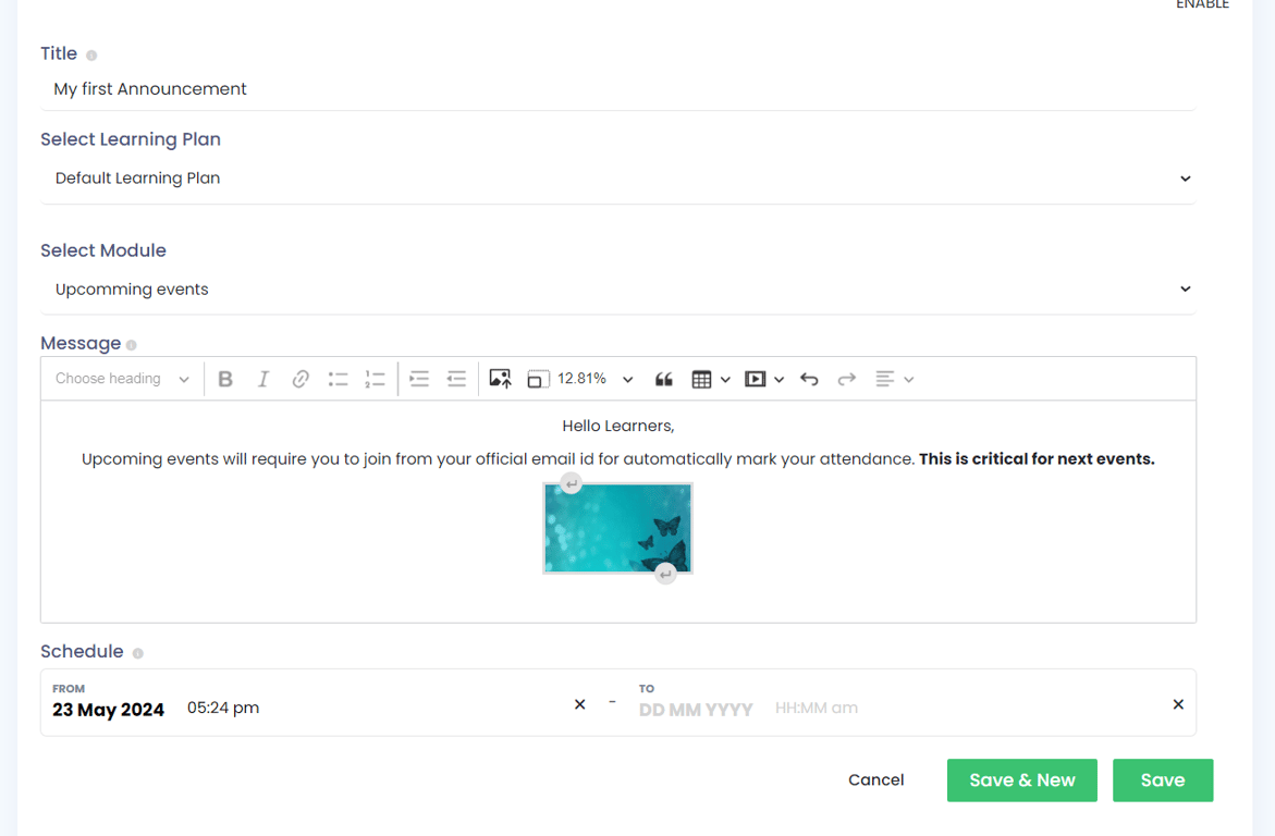- Then add your announcement message. The announcement message field includes a rich text editor that offers a wide range of features to help you create and format your announcements effectively like text formatting, alignment, adding images from the Media library, etc.
