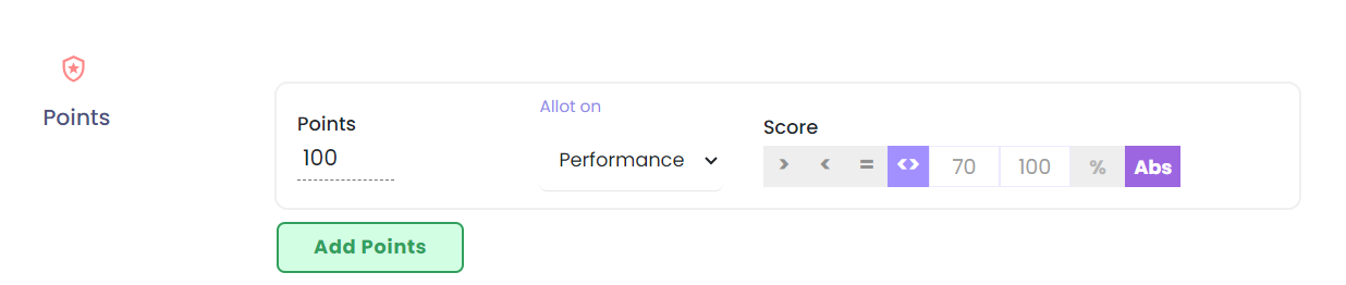 E.g. Allotting 100 points on performance when the score is more than 50% of the total achievable scores in the learning plan or when the score is less than, equal to, or between a lower or upper limit. When setting score with between criteria you will need to specify 2 score values.