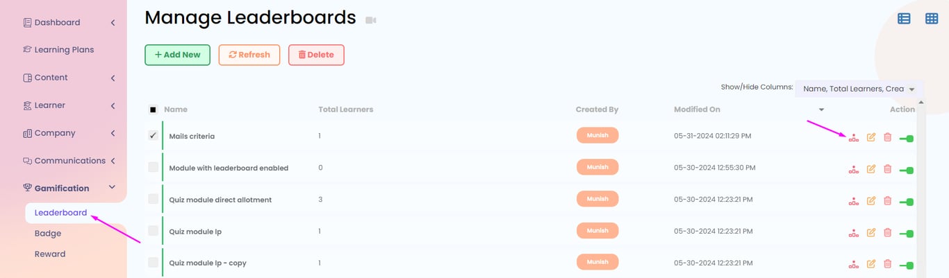 - Grid View: Locate your leaderboard by the name of the learning plan and click on the leaderboard icon from the Actions column.