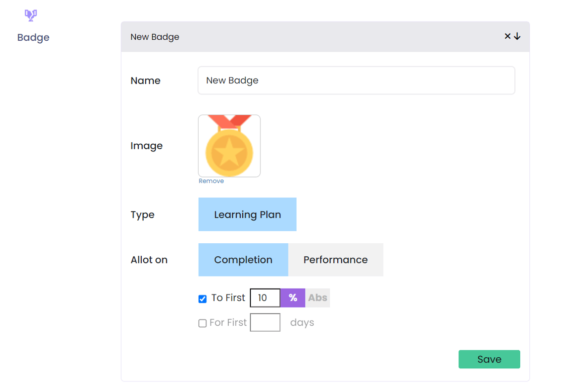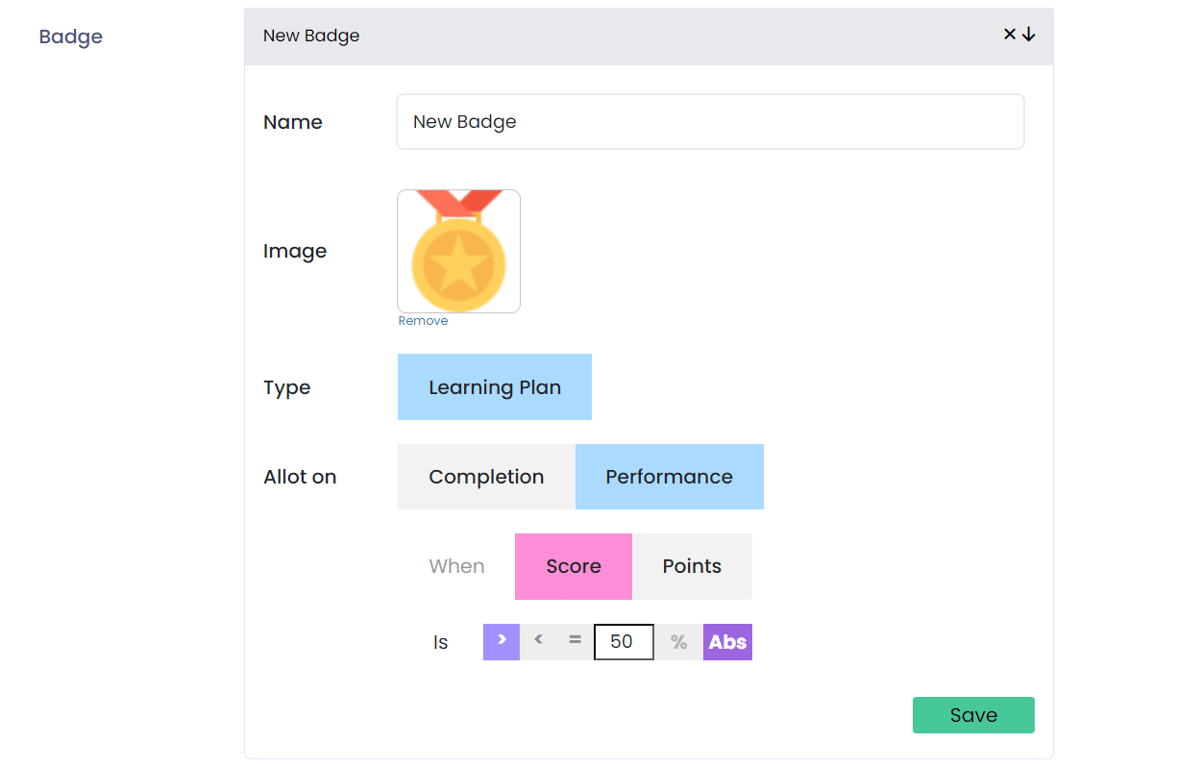 E.g. Allot badge when the score is more than, less than, equal to, or between 2 values which can be either an absolute or a percentage value. Similarly, you can assign a Badge based on points earned by the learner in the learning plan.