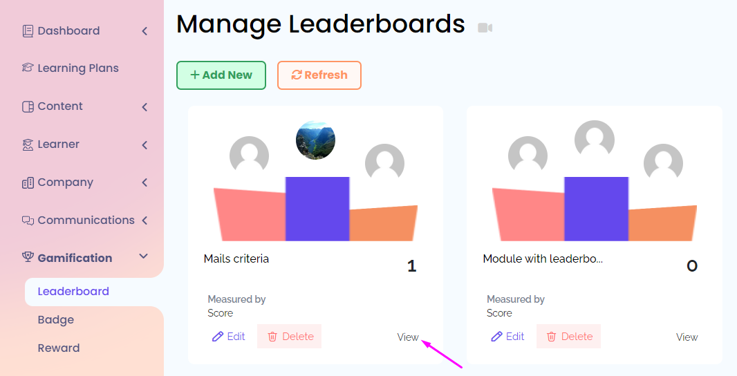 - Card View: Locate your leaderboard by the name of the learning plan and click on the View button inside the card.