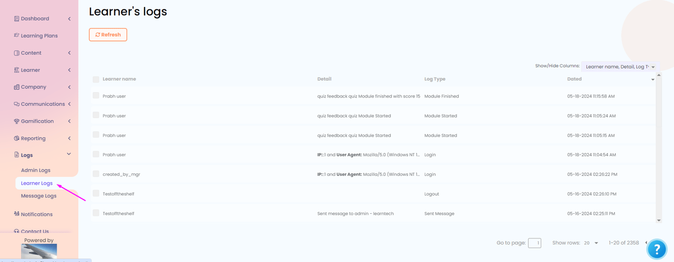 Welcome to the Learner Logs documentation page. This page logs various learner actions that occur within the system.