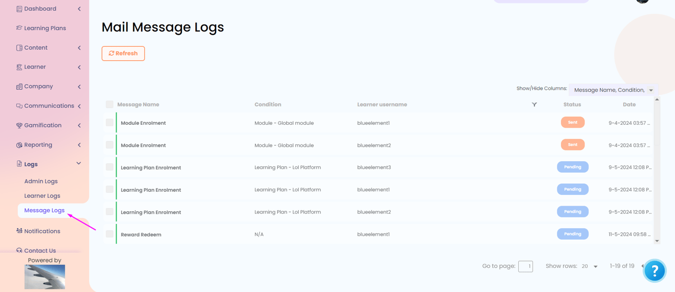Welcome to the Mail Message Logs documentation page. This page logs various emails that are being sent to your company learners.