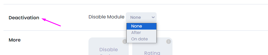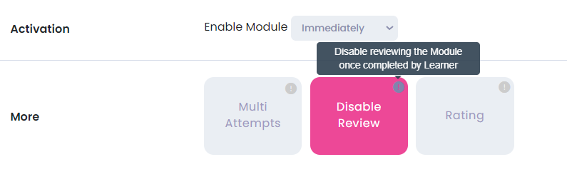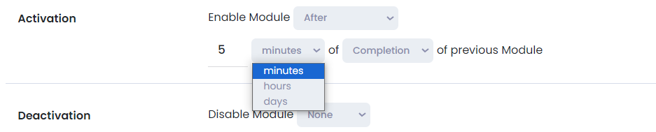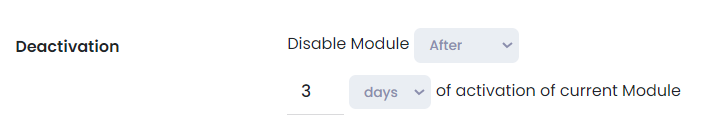 - After: Disable the module for attempting after a particular days of activation of the module. When the module gets disabled, no learner will be able to attempt the questions of the modules. The learners who have already completed the module can still review the module.