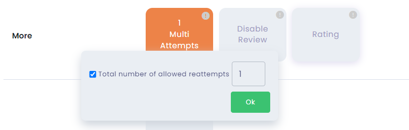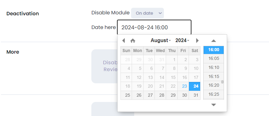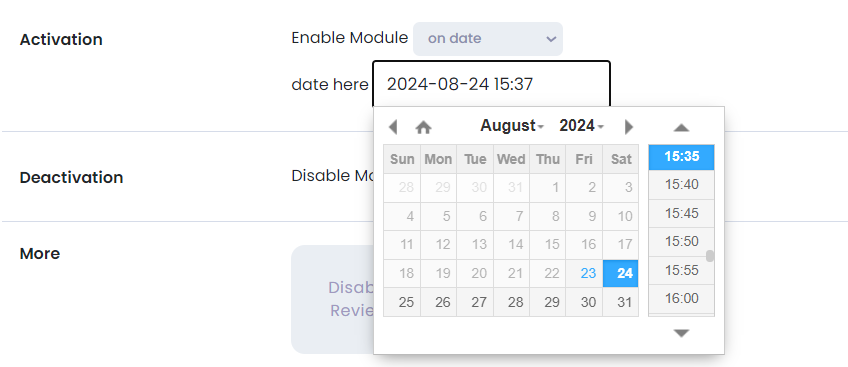 - On Date: Disable the module for attempting after a particular date and time. When the module gets disabled, no learner will be able to attempt the questions of the module. The learners who have already completed the module can still review the module.