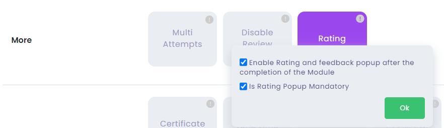 Rating: Enabling rating and feedback popup after a learner completes this module. We can make the rating mandatory too.
