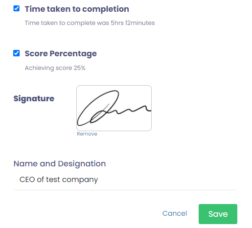 - Score Percentage: Control whether you want to show the score percentage on the certificate. The scores are only allotted on Quiz type modules otherwise the scores will be shown as 0.