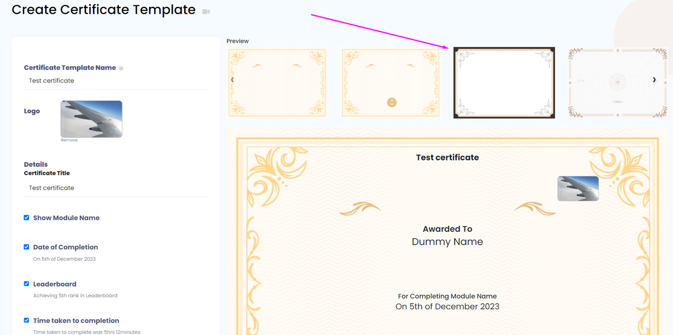 After filling out the form, the preview will reflect how the certificate is going to look for the learners.