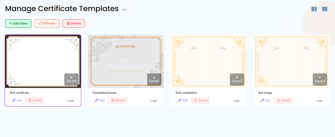 The card view shows the name of the certificate template, template background, issued count, edit, delete, and logs button in a card-like format.