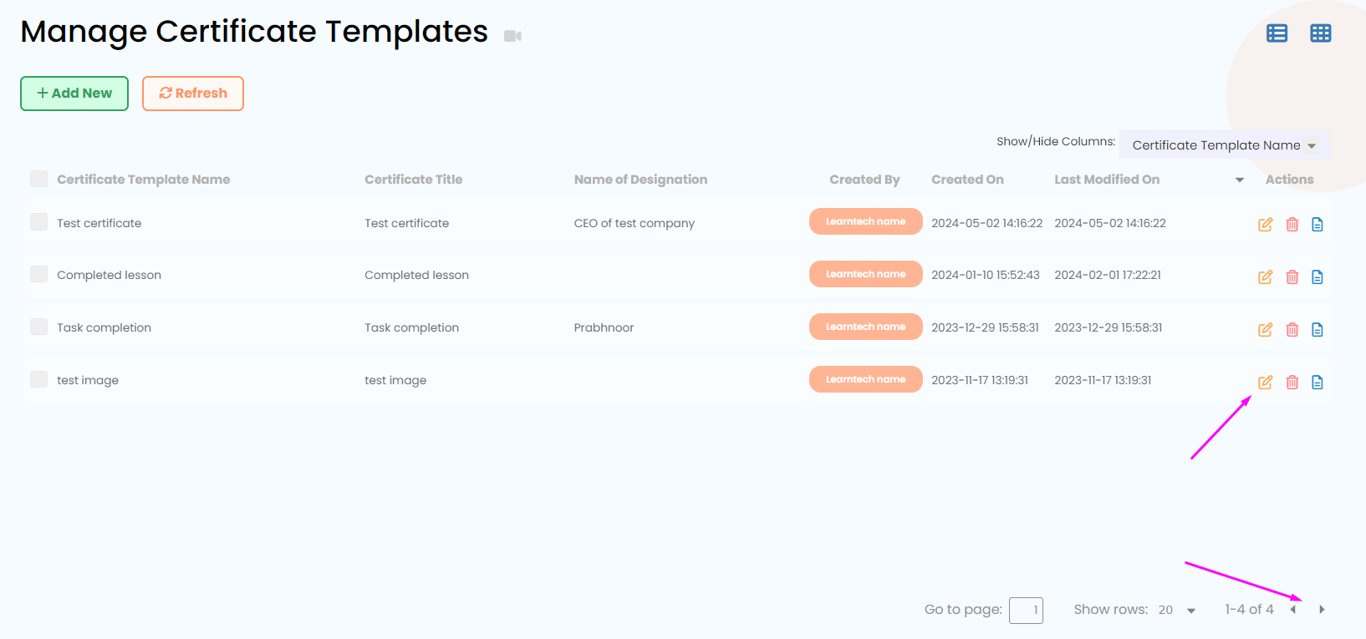 Change pages: Change how many rows you want to show on one page, go to different pages, if you have a lot many certificate templates.