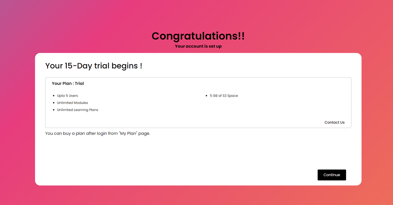 You are then taken to the success page here you will see what features does your trial plan has.