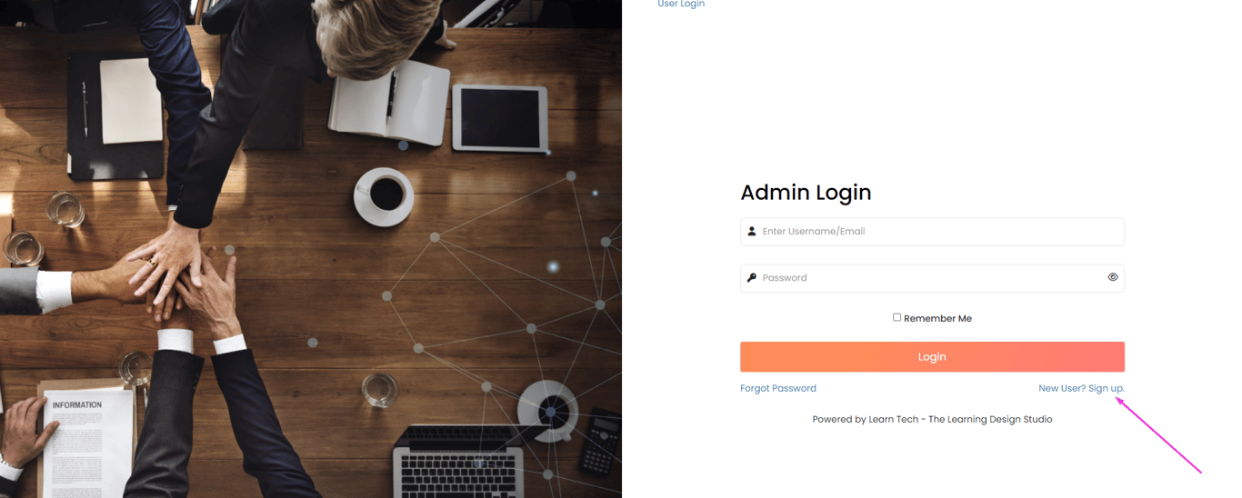 Click on the Sign-up link beneath the Login button. This will open the Signup page.